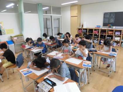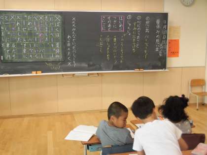 夏休みの思い出について振り返り、ノートにまとめ、作文にしています。出来事について、順序に沿って書き進めています。楽しい思い出がたくさんで、書くことがいっぱいです。