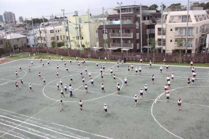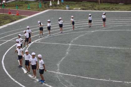 若小新校舎の校庭は、今までよりも広いので立ち位置を確認します。