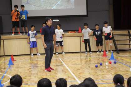 パラリンピックでも話題になっているボッチャのルールを、運動委員会の子たちが説明します。
