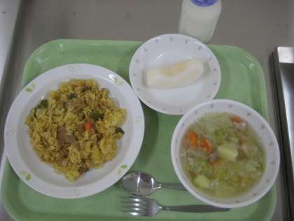 ツナピラフ キャベツとベーコンのスープ 梨 牛乳