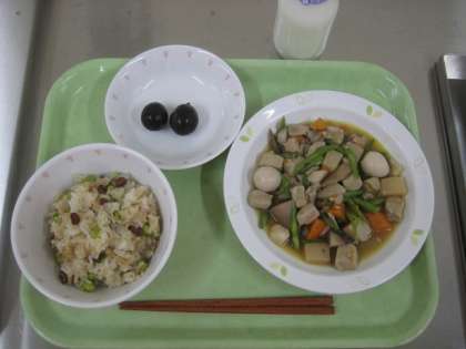 まめまめおこわ 鶏肉と里芋のうま煮 ぶどう 牛乳