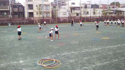 今日はハードルを使わずに、フラフープを使ってリズミカルなステップの練習をしました。