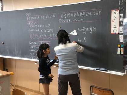 2年生では、三角形と四角形について学習をしています。普段何気なく見たり聞いたりしている三角形や四角形にも、いろんな種類があることを学びました。ここの分野は、子どもたちの興味・関心を掻き立てる様子が見られます。今後も楽しみです。