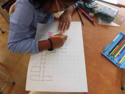 算数では、学習した形を使い模様づくりを行いました。直角三角形・正方形・長方形と、それぞれの形のきまりを確認しながら、活動しました。きれいな模様にすることが、楽しみです。