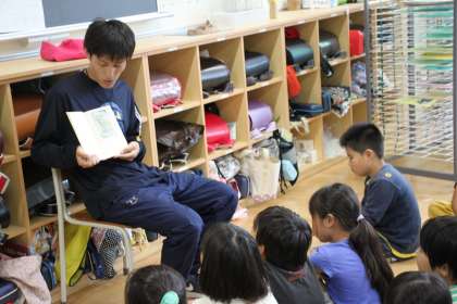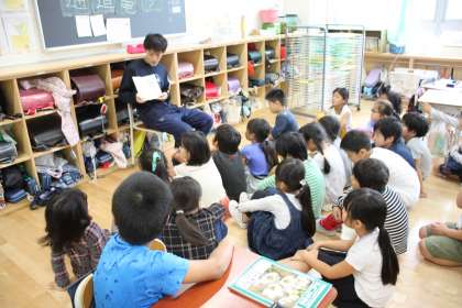 2年生の教室で、担任の先生が読み聞かせをしています。