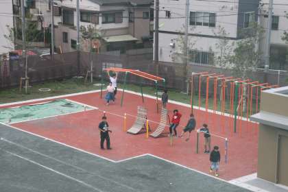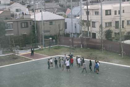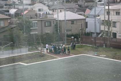 6年生達が校庭のあちらこちらで写真を撮っています。