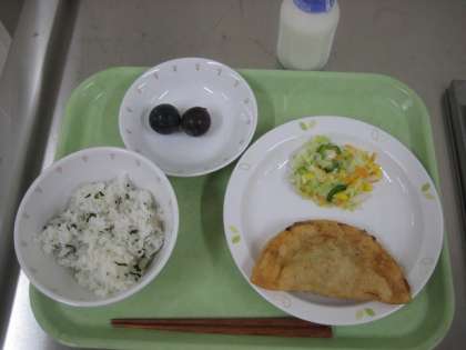 わかめごはん よっちゃんとリンちゃんの友情パオズ コーンサラダ ぶどう 牛乳