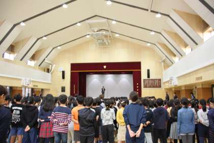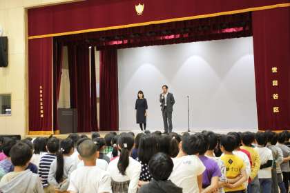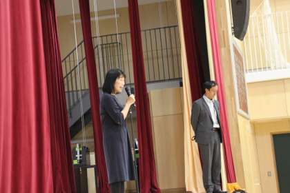 今朝の全校朝会には、土曜日で若小を退職された先生があいさつに見えました。