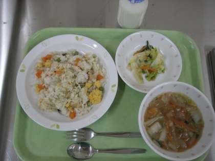 チャーハン 中華サラダ 白菜と春雨のスープ 牛乳