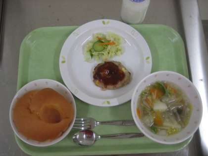 ミルクパン アップルチーズハンバーグ キャベツサラダ ベーコンと白菜のスープ 牛乳