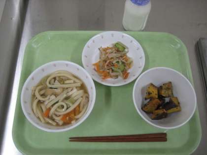 今日の給食は、野菜のたくさん入った煮込みうどん、さきいかやごぼうの入ったかみかみサラダ、旬のさつまいもを使った大学芋を作りました。