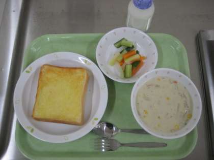 ガーリックトースト コーンシチュー ピクルス 牛乳
