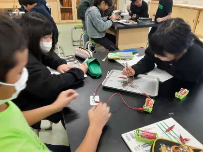 釘の鉄心とストロー、そしてエナメル線というスタンダードな素材で電磁石づくりに取り組む5年生。