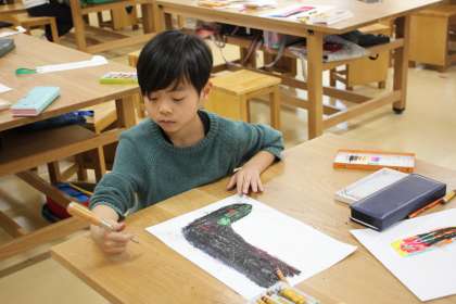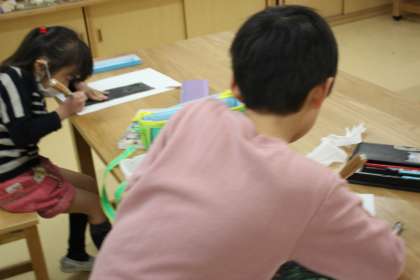 黒いクレヨンをひっかきながら文字や絵を描くスクラッチの技法を使います。