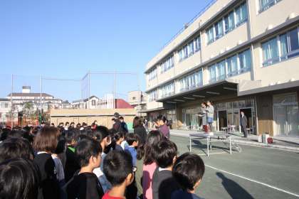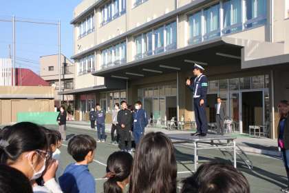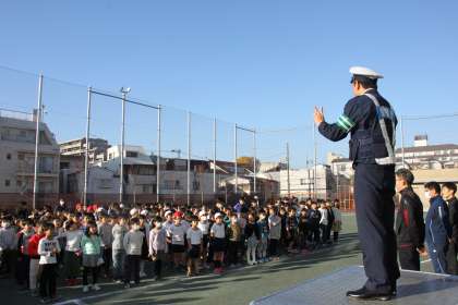 今朝の集会の時間に、世田谷警察交通課からお巡りさんが来て、お話をしてくれました。