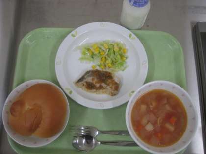 ミルクパン 魚のムニエル マリネソース コーン入りフレンチサラダ ミネストローネ 牛乳