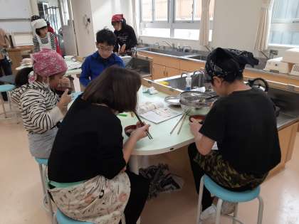 ていねいに丁寧におみそ汁づくりに励む5年生。