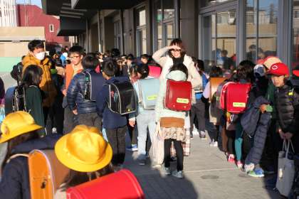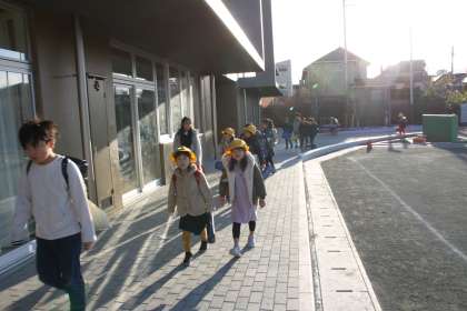 暖かい日差しを受けながら登校してくる子たちをむかえる先生もまぶしそう!!