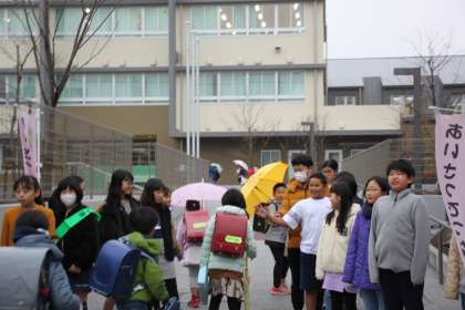 今朝は寒い朝になりましたが、若小の正門では元気いっぱいの声が響いていました。