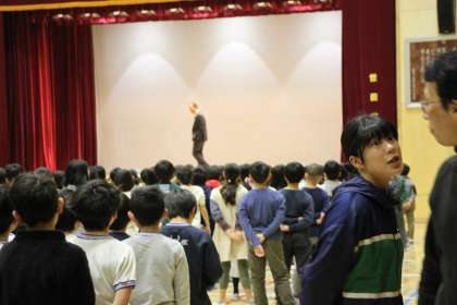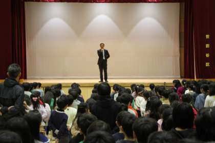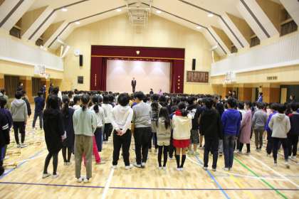 校長先生とあいさつをして、しっかりとお話を聞く全校児童。