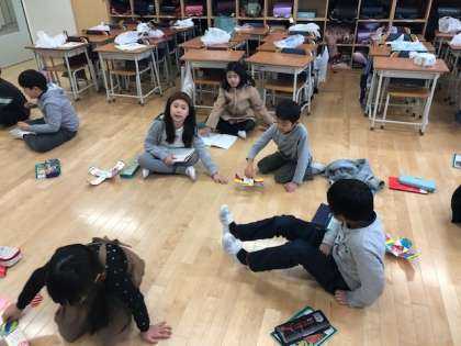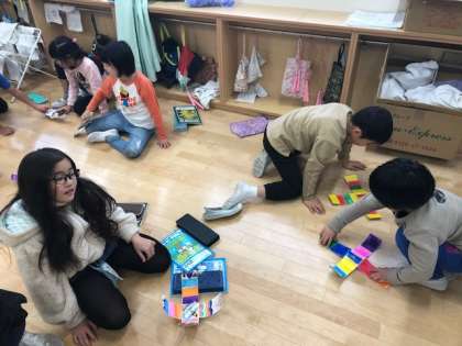 こまづくりも終わり、いよいよコンテストを行いました。こまが、どれだけ回るか競い、真剣な表情でこまを回す様子が見られました。子供たち一人ひとりが、自分のこまに満足していました。