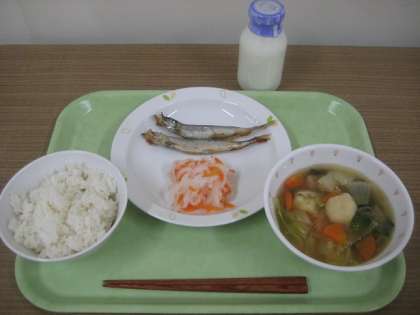 麦入りごはん 焼きししゃも 紅白なます すいとん 牛乳