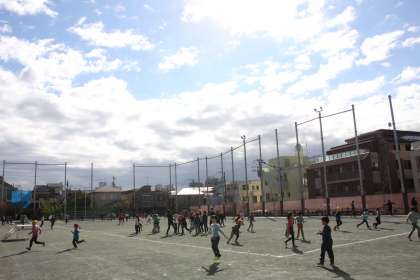 休み時間の校庭では、短なわに取り組む子たちの姿がたくさん見られます。