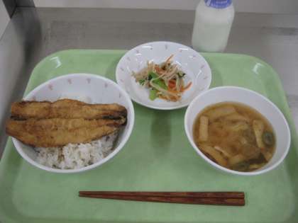 麦入りごはん いわしのかば焼き おひたし じゃがいもとわかめのみそ汁 牛乳