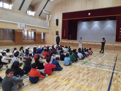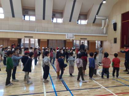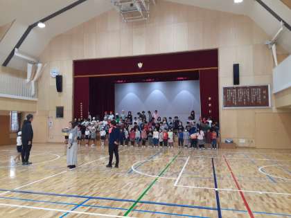 1年生が体育館で、日本語暗唱発表会に向けた練習をしています。