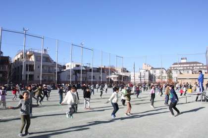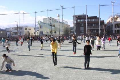 さすがに全学年は同時に入れないので、2交代制になりましたが、全校児童が連続跳びを行いました。