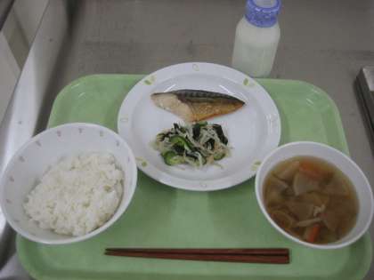 ごはん さばの塩焼き もやしとわかめの甘酢かけ 根菜汁 牛乳