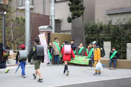 11班の子達が正門前に集結、元気いっぱいの朝のあいさつをしました。