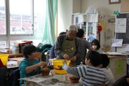 植木鉢を入念に準備をして、球根植えに挑む5年生たち。