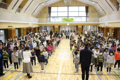 全校で代表児童の6年生と一緒に、あいさつをしました。