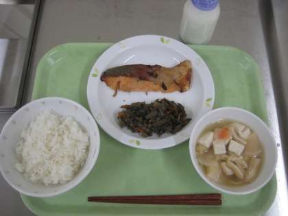 ごはん あさたろうは正義の見方!鮭のねぎみそ焼き きんぴらごぼう 吉野汁 牛乳