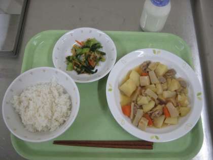 麦入りごはん 肉じゃがうま煮 野菜のおかかかけ 牛乳