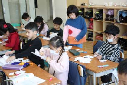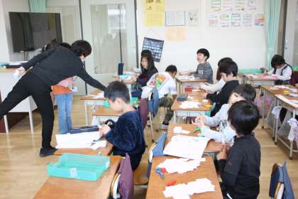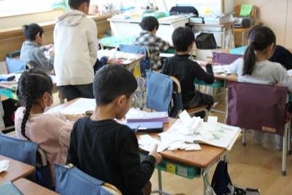 1年生が算数の時間に、大きな数を紙に書いています。