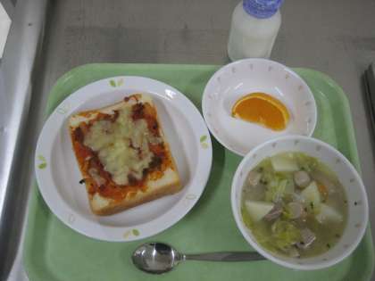 今日は「マルゲリータのまるちゃん」という本よりピザトーストを作りました。手作りピザソースを1枚ずつ食パンにぬってチーズをかけて焼き上げました。