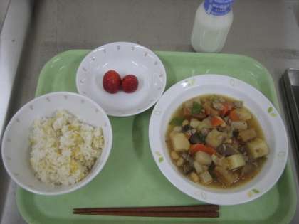 雑穀ごはん 豆入り筑前煮 いちご 牛乳