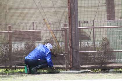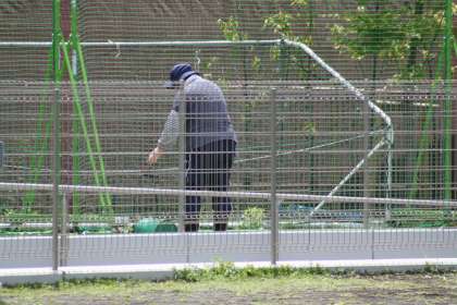 そこで主事さんたちが今日は校庭の草取りをしています。