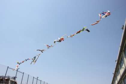 屋上とフェンスの設備を巧みに使って、今年もにぎやかなこいのぼりが校庭を舞います。