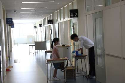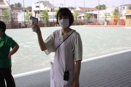 玄関では保健室の先生が非接触体温計を持ってスタンバイ!