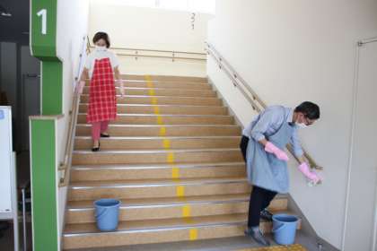 6年生が下校した後は、みんなでせっせと消毒作業を行います。