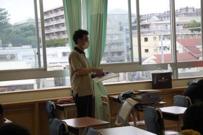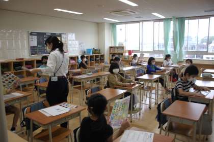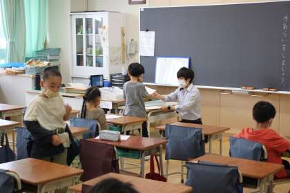 万が一、カードを忘れた子のために、非接触体温計を持った先生が待機しています。