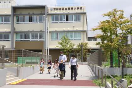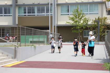 夏のような日差しの中、2、5年生が元気に下校していきます。
