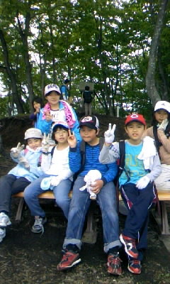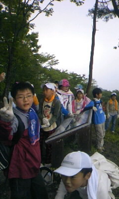 若林小学校 5年1組28名引率7名全員で登頂しました。がんばれ!あきらめないで!という助け合いの声で登りました。登りはじめ9時20分登頂11時40分。