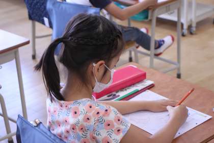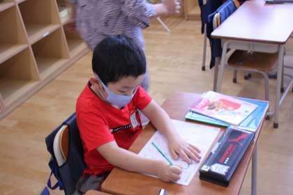 1年生が国語の時間に、ひらがなの書き取りをしています。