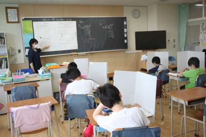 区が用意してくれた板を机に設置しての学習の様子です。