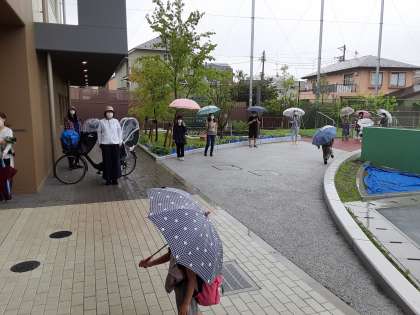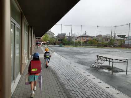 雨の中、分散登校Bグループの子たちが下校していきます。