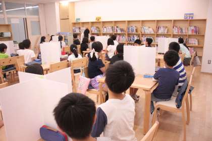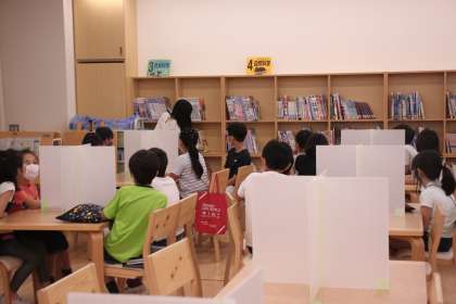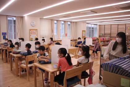 今年度から学校図書館司書さんが変わりましたが、みんなで静かに図書室オリエンテーションを受けています。
